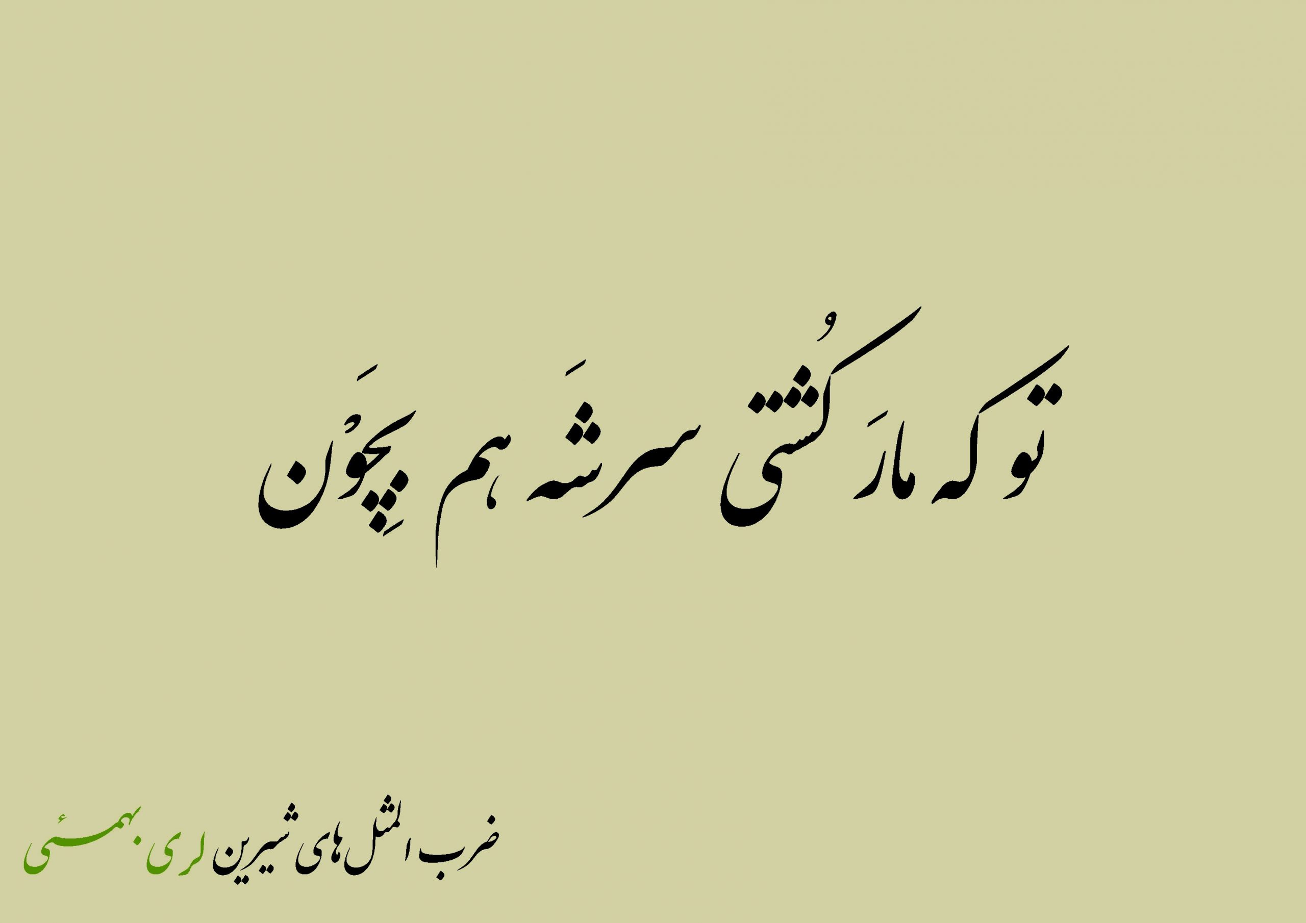 ضربالمثل لری بهمئی تو که مار کشتی Published ۱۴۰۰/۰۷/۲۹ at 2560 × 1810 in ضربالمثل لری بهمئی تو که مار کشتی یعنی تو که مار را کشتی، سرش را هم له کن که خیالت راحت باشد. کنایه از به سرانجام رساندن دقیق و تمام و کمال کارها و امورات که اصطلاحاً مو لای درز آن نرود.