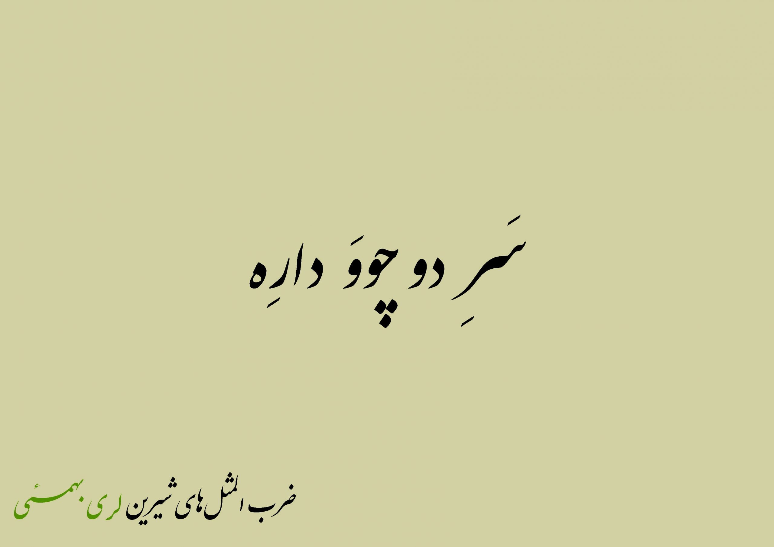 ضربالمثل لری بهمئی سر دو چوو داره Published ۱۴۰۰/۰۸/۱۴ at 2560 × 1810 in ضربالمثل لری بهمئی سر دو چوو داره فرد به اصطلاح رند و زرنگی که در هر صورت و از هر طرف فقط به فکر سود و منفعت خویش است. میتوان معادل فارسی آن را در مثل هم از آخور خوردن و هم از توبره خوردن دید.